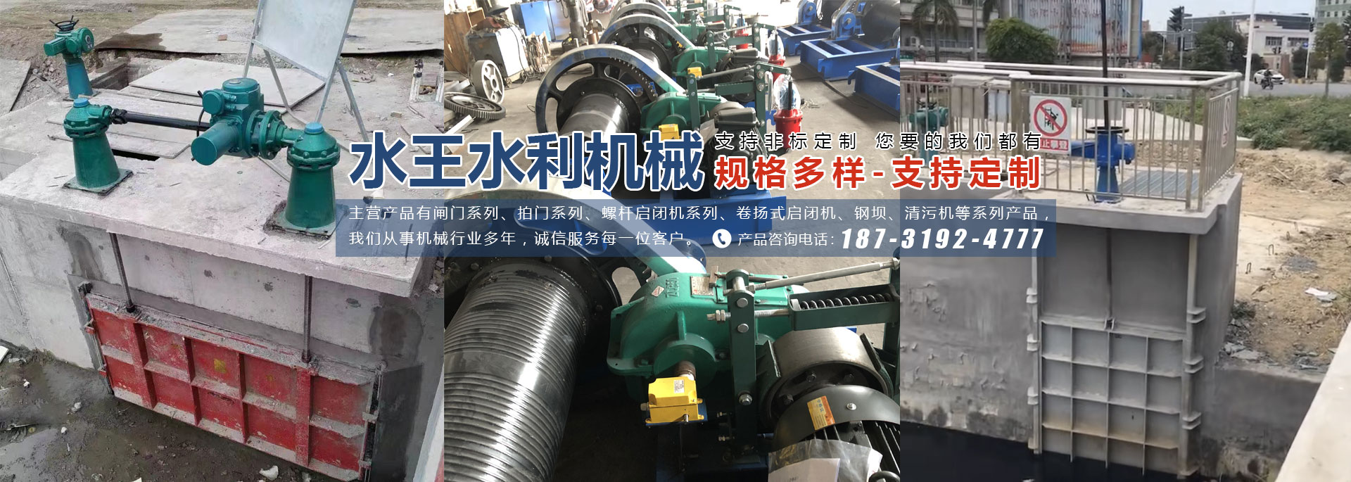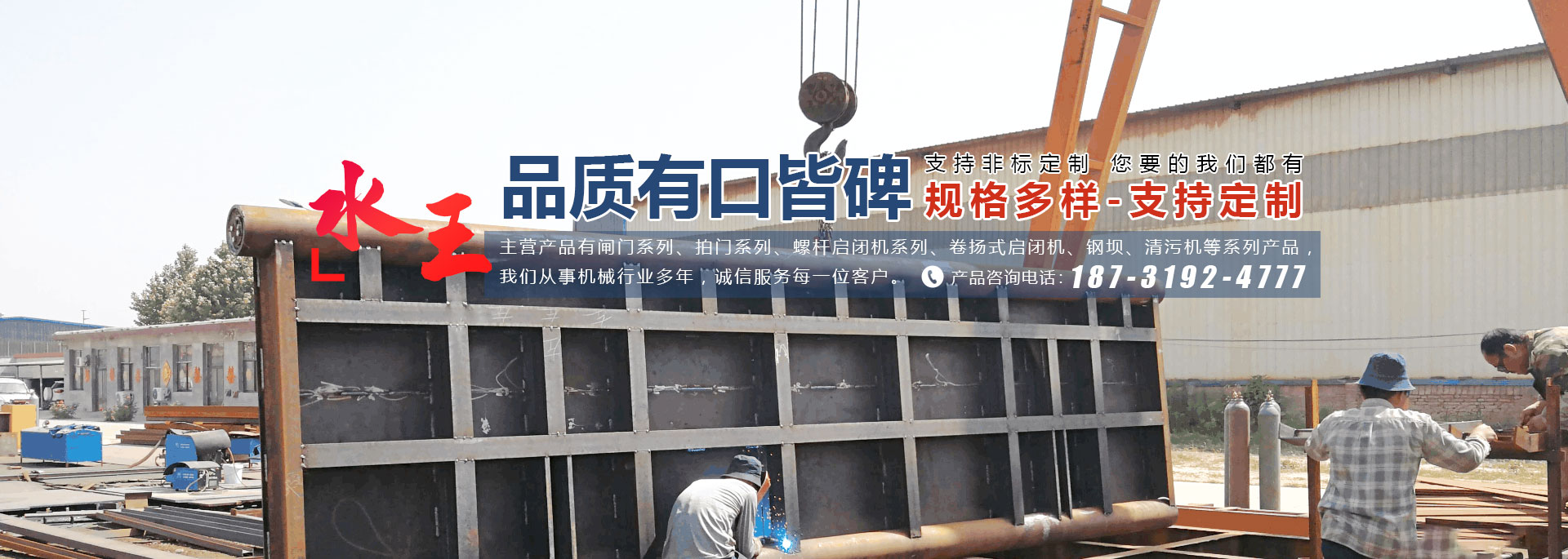 河北水王水利機械有限公司專業生產銷售鑄鐵閘門、啟閉機、閘門、固定卷揚啟閉機、移動卷揚啟閉機、電裝啟閉機、鑄鐵鑲銅閘門、鋼制閘門、翻板閘門、不銹鋼閘門、景觀壩、鋼壩、液壓翻板閘門、鑄鐵拍門、鋼制拍門等各種材質拍門、橡膠止水的專業制造、生產及指導安裝的綜合性廠家,具有現代化管理模式,產品結構合理,性能可靠,確保向客戶提供高質量的產品和周到的售后服務,是制造、銷售、安裝一體化的規模型水利工程機械生產企業?! ≈鲗Мa品: 1、螺桿式啟閉···